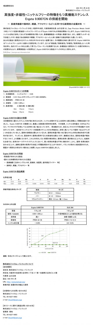 株式会社ジャイカム・パシフィック(本社:大阪市中央区、代表取締役社長:山口正俊)は、Zapp Precision Metals GmbH(本社:ドイツ)社製の高強度ニッケルフリーステンレス「Ergste 9.9007CN」の供給を開始いたします。Ergste 9.9007CN は、ニッケルを殆ど含有しておらず生体親和性が高いため、医療機器製品への用途に最適であり、また、金属アレルギーを引き起こしやすい製品である腕時計や眼鏡、アクセサリーといった人体に接触する製品用途にも適しています。