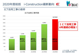 全国土木工事情報D-NETにおける配信データ(北海道開発局、各地方整備局、沖縄総合事務局、国土技術政策総合研究所の発注工事)の2020年度のICT活用工事の公告数は4,542件。前年度2019年度の3,803件を上回った。コロナ禍で工事公告が減少する中、ICT活用工事の増加傾向にある。2016年から続くi-Constructionの取り組みが踏ん張りを見せた。