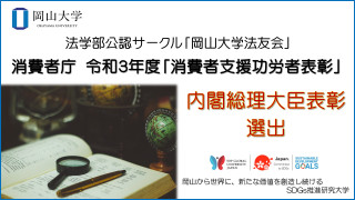 消費者利益の擁護・増進のために活躍する方々を表彰する、消費者庁の令和3年度「消費者支援功労者表彰」が2021年4月28日 発表され、岡山大学の法学部公認サークル「岡山大学法友会」が、筆頭となる内閣総理大臣表彰に選ばれました。