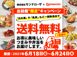 株式会社モンテローザ(本社:東京都武蔵野市、代表取締役:大神輝博)は、出前サービス「出前館」(運営:株式会社出前館)を導入している一部店舗(バーチャル店舗を含む291店舗)において、2021年6月18日(金) ~2021年6月24日(木) の7日間限定で「送料無料キャンペーン」を開催します。期間中に対象店舗で出前サービス「出前館」からご注文いただいた商品を送料無料でお届けします。居酒屋「白木屋」の“タルタル!チキン南蛮弁当”や「魚民」の“魚民特製!鉄鍋餃子”、漁港直送「目利きの銀次」の“海鮮四種丼”、炭火焼き料理・湯葉豆富料理「千年の宴」の“まるごと牛タン一枚焼弁当”などの人気メニューや話題のお弁当が、リーズナブルにご注文いただけます。一度試してみたかった!というお客様は、是非この機会に出前サービスをご利用ください。