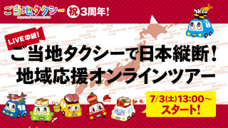 日本ご当地タクシー協会は、発足3周年を記念して7月3日 、「ご当地タクシーで日本縦断!地域応援オンラインツアー」を実施します。九州から北海道まで6台のご当地タクシーに順次乗車して観光地を巡る仮想旅。当協会YouTubeチャンネルでお届けします。