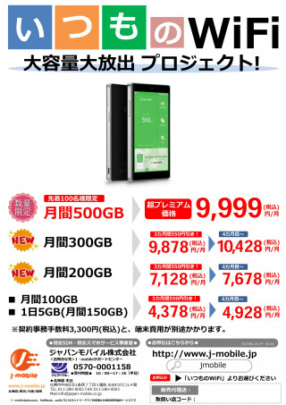 ジャパンモバイル株式会社(本社:札幌市中央区、代表取締役社長:賣場崇大、以下「J-mobile」)は、2021年7月12日 より、「いつものWiFi 大容量大放出プロジェクト」の一環として、大容量月間500GBコースを数量限定で発売します。申込受付は2021年7月12日 より開始します。