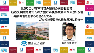 国立大学法人岡山大学(本部:岡山市北区津島中、学長:槇野博史)の岡山大学病院(本院:岡山市北区鹿田町、病院長:前田嘉信)精神科神経科の藤原雅樹助教と山田了士教授ら、国立がん研究センター島津太一室長ら、島根大学の稲垣正俊教授らの共同研究グループは、かかりつけ精神科医療機関の外来で行う個別のがん検診勧奨法が、市町村によるがん検診の案内のみと比べて、統合失調症患者さんの大腸がん検診受診率を向上させることを確認しました。統合失調症患者さんに対するがん検診勧奨法の有効性を調べた研究はこれまでになく、世界でも初めての成果です。