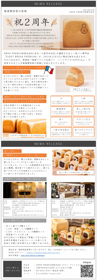 GRAN PREMIUM株式会社(本社:大阪市中央区)が運営する生ミニ食パン専門店「EIGHT BREAD PREMIUM」が、2021年11月1日 に開店2周年を迎えます。