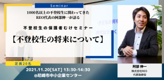開校から20年、1000名以上の不登校生に関わってきたREO代表の阿部伸一が、「不登校生の将来について」をテーマにセミナーを行います。