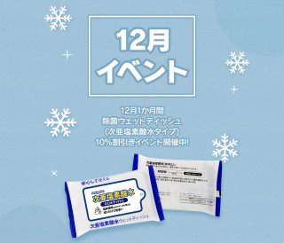 今月イベント対象の「次亜塩素酸水ウェットティッシュ」は 防疫成分である次亜塩素酸水を使用しており、お子様からお年寄りまで皮膚の弱い方でもお使いいただける除菌ウェットティッシュです。