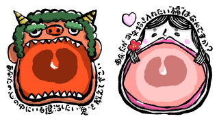 ・みんなの福の神と鬼を募集…みんなで豆撒きはできないけれど、みんなの福と鬼を境内の特設掲示板に書込み&掲示し、「コレわかる!私も」「この人の福が訪れますように」など、少しでも互いの心が集える企画を考えました。豆型の用紙に自分の鬼や福の神を記入し、イラストに描かれた鬼と福の神の大きな口の中に貼っていきます。用紙のひとつひとつに宮司がコメントを寄せます。