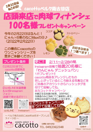 埼玉県川越市・ベルク南古谷にある洋菓子cacotto(カコット[株式会社全菓 (所沢 )/代表:豊田雅之] では、2022年2月22日 のねこの日に因んで、 店頭来店で cacottoの肉球フィナンシェがもらえる先着100名様プレゼントキャンペーンを開催いたします。(~ 2/28まで)