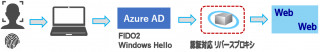 アクセスの手順としてユーザーは、Azure ADへのログイン時にWindows HelloやFIDO2方式の顔認証や指紋認証を行います。認証が通った後にAzure ADと認証連携を行っているリバースプロキシ・アプライアンス経由でターゲットのWebへアクセスする運用が出来ます。厳格な本人確認の上で自社のWebサーバーへアクセスさせたい場合などに適合するリバースプロキシ・アプライアンスです。