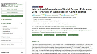 Int. J. Environ. Res. Public Health誌はインパクトファクターが3.39もある著明な公衆衛生学に関する国際的専門誌です。それが「ポストコロナ時代、長寿社会における介護支援ニーズ:国際的視点から鑑みた多面的検討のあり方とは(原題 Tackling Long-Term Care Needs in Ageing Societies in (Post) Pandemic Times: Multidisciplinary Research Approaches in an International Perspective)」という特集号を組み、2022年7月 末まで、題名に相応しい論文寄稿を募集しています。そこに合同会社パラゴン(本社:東京都港区 URL: https://pro-sangyoui.com )代表の櫻澤 博文も共著者として寄稿したところ3月10日 付けで採択され、この程オンラインで公開( https://www.mdpi.com/1660-4601/19/6/3284 )されました。筆頭執筆者は旭川医科大学医学部社会医学部講座講師の神田 浩路先生(URL:https://researchmap.jp/kojikanda )です。