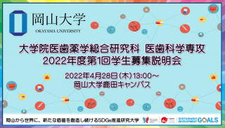 国立大学法人岡山大学(本部:岡山市北区、学長:槇野博史)大学院医歯薬学総合研究科・医歯科学専攻(修士課程)では、2022年4月28日(木) 13:00から「2022年度第1回学生募集説明会」を本学鹿田キャンパス(岡山市北区)で開催します。