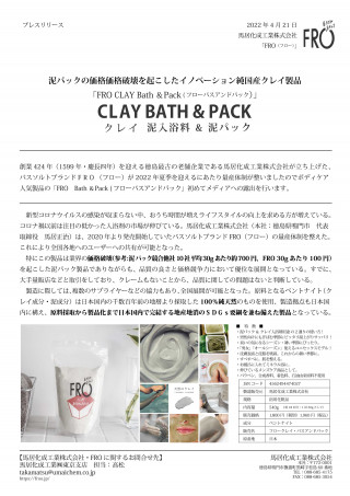創業424年(1599年・慶長四年)を迎える徳島最古の老舗企業である馬居化成工業株式会社が立ち上げた、バスソルトブランドFRO(フロー)が2022年夏季を迎えるにあたり2022年5月1日 より量産体制が整いましたのでボディケア人気製品の「FRO Bath &Pack (フローバスアンドパック」初めてメディアへの露出を行います。この製品は業界の価格破壊(参考:泥パック競合他社10社 平均30gあたり約700円、 FRO 30gあたり100円)を起こした泥パック製品でありながらも、品質の良さと価格競争力において優位な展開となっている。すでに、大手量販店などと取引をしており、クレームもないことから、品質に関しての問題はないと判断している。