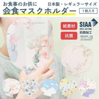 本製品は、マスク会食時に口元に当てるだけで飛沫の飛散防止ができるマスクホルダーです。お食事の際に、マスクの着け外しの手間がなく、会話が楽しめます。両側の切り込みを使うことで、マスクが取り付けられます。また、口元に当てる面(マスクホルダーの内側)に抗菌加工が施されているので、衛生的かつ安心してご使用が可能です。また、両側の切り込みを使い、マスクが取り付けられます。