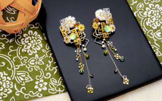 光源氏と並べ比べられる程の容姿と才能を持ち、友人思いで人情に厚い人柄。そんな彼の風流な佇まいをキラキラ輝く萌黄色のガラスと色とりどりの煌びやかモチーフで表現しました。男らしさを表現するスクエアのパーツを多用し、奥行きのあるデザインで一見すると浮いているように感じる形に仕上げています。