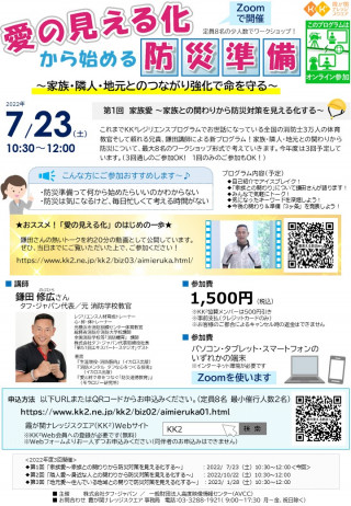 今年度の新企画として、元消防学校教官の鎌田修広さんを講師にお迎えし、避難方法や備蓄品といった視点ではなく、「愛」から考える防災とは何か?を講師及び参加者で語り合うプログラム『「愛の見える化」から始める防災準備』を全3回オンラインにて開催いたします。