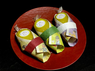 この度、当店では鎌倉市観光協会オリジナルのキャラクター「北条義時ら13人の重臣」をモチーフにしたオリジナル和紙を、全3色(クリーム色・黄緑色・紫色)にて製作しました。こちらのオリジナル和紙にお包みした『花御成』【鎌倉・13人の重臣ver.】は各色に13人全員のキャラクターを配しておりますので、お召し上がりいただいたあとは和紙にもご注目いただき、鎌倉時代に思いを馳せていただくのもおすすめです。