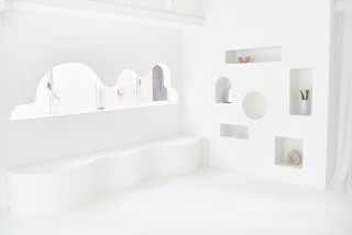 アーチや変形ベンチをふんだんに取り入れ、ただの真っ白ではない唯一無二のイマドキ空間を演出。海外テイストの外壁をモチーフにした壁でおしゃれ感もアップ。天井高3mの真っ白な空間はアレンジし放題。