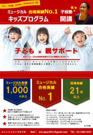 当社ではこれまでも「心と体を育む子役塾」をモットーに、様々なテーマを持って子役レッスンプログラムを手掛けてきました。子役の 活動できる期間には限りがあり、いざ出演したい作品のオーディション情報が開示された際に、慌ててレッスンをはじめたり、レッスン を増やしたり、レッスン場を探したり...タイミングや準備が間に合わず、「もっと早くから準備しておけば...」と涙を流すお子さんの姿、 サポートしきれず悔しい思いをする親御さんの声をたくさん聞いてきました。「キッズプログラム」はメニィレッスンスタジオ代表・岡田紗 知の親子の挑戦を万全の体制で挑む環境づくりの応援をしたい、実際に現場に出て挑む<子ども>と、子どもといちばん近い場 所でサポートする<親御さん>へサポートメソッドを伝授したいという想いから、「子ども×親サポート」にこだわりました。