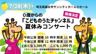 「こどものうたチャンネル」は、0歳からの「こどものうたチャンネル」夏休みコンサート(埼玉県越谷市) を2022年7月28日 に初開催いたします。