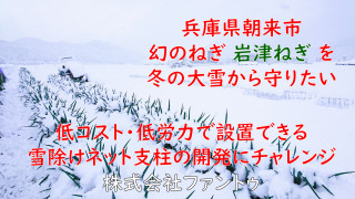 天空の城「竹田城跡」でおなじみの兵庫県朝来地方の郷土野菜である岩津ねぎを冬の大雪から守る為の雪除けネットの改良と導入について資金調達を考えております。