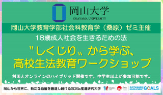 国立大学法人岡山大学(本部:岡山市北区、学長:槇野博史)の大学院教育学研究科では、教育科学専攻の大学院生宮本あゆはさんが企画した高校生対象の法教育ワークショップ「18歳成人社会を生きるための法〝しくじり〟から学ぶ、高校生法教育ワークショップ」を2022年8月28日(日) に岡山大学教育学部(岡山市北区)で開催します。今回は、対面とオンラインのハイブリッド開催です。