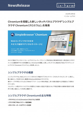 キオスク端末ブランドのインフォームプラス(エム・ティ・プランニング株式会社(東京都渋谷区)と株式会社ツボタテクニカ(兵庫県神戸市)の共同運営)は、Chromiumを搭載した新しいタッチパネル端末向けWebブラウザ「シンプルブラウザ Chromium(クロミウム)」を2022年10月4日 に発表しました。