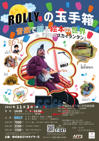 奈良ならではの場所で、天平衣装に身を包みエンターテナーROLLYが奈良に因んだ絵本を中心に、音楽朗読会を開催します。奈良市が使いあぐねていた庭園は、銀閣寺と金閣寺と同じく日本に9か所しかない特別史跡、特別名勝庭園指定のスゴイ場所。今年の11月3日 は旧暦の10月10日 にあたり十日夜(とうかんや)と言われる田の神が山に帰り収穫に感謝する夜でもあります。大型スクリーンに絵本を投影しながら歌う、読む、話すROLLYの世界を展開します!