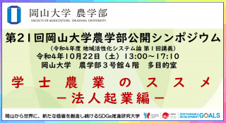 国立大学法人岡山大学(本部:岡山市北区、学長:槇野博史)農学部では、令和4年度「地域活性化システム論」を開催いたします。第1回目は「岡山大学ホームカミングデイ2022」と同日開催となる2022年10月22日(土) に「学士農業のススメ-法人起業編-」と題して開催します。
