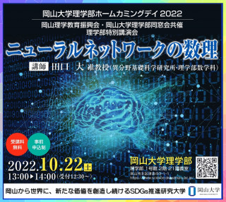 国立大学法人岡山大学(本部:岡山市北区、学長:槇野博史)の理学部では、2022年10月22日(土) に開催される「岡山大学ホームカミングデイ2022」に合わせて下記のイベントを開催いたします。