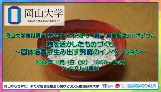 国立大学法人岡山大学(本部:岡山市北区、学長:槇野博史)では、寄付講座微生物インダストリー講座の開設を記念し、「麴を活かしたものづくり 固体培養が生み出す発酵のイノベーション」と題したシンポジウムを、2022年11月1日(火) の現地とオンラインのハイブリッド開催します。