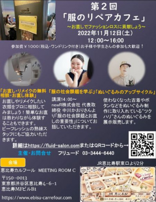 2003年設立のファッションのリペア・リメイクを手掛ける、フリュード(所在地:東京・恵比寿、代表:飯塚真衣子)は「第2回服のリペアカフェ」を2022年11月12日(土) 12時~16時に開催します。