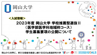 国立大学法人岡山大学(本部:岡山市北区津島中、学長:槇野博史)では、2023年度岡山大学学校推薦型選抜II(医学部医学科地域枠コース)学生募集要項について、以下の通り公開しましたので、お知らせします。