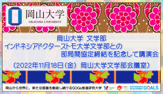 国立大学法人岡山大学(本部:岡山市北区津島中、学長:槇野博史)文学部では、インドネシアドクターストモ大学文学部との部局間協定締結を記念して、2022年11月18日(金) にドクターストモ大学文学部日本語学科学科長のデシ・イルマヤンティ先生の講演会「ドクターストモ大学文学部日本語学科における日本語学習の紹介」を本学津島キャンパスの文学部会議室(文法経1号館2階)で開催します。