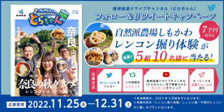 11月に公開された動画に関連した、奈良県山添村「自然派農場しもかわ・レンコン掘り体験(7,000円相当)」が、抽選で5組10名様に当たるキャンペーンです。