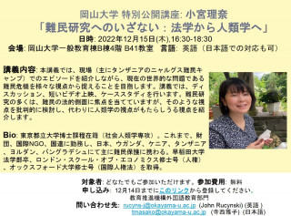 国立大学法人岡山大学(本部:岡山市北区、学長:槇野博史)では、2022年12月15日(木) に岡山大学津島キャンパスで、特別公開講座「難民研究へのいざない:法学から人類学へ」を開催します。