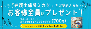 対象期間中に弁護士保険STATION経由で、ミカタ少額短期保険株式会社「弁護士保険ミカタ」の契約申込を完了し、ご契約が成立されたお客様全員に、「ブルーボトルコーヒー カフェで使えるドリンクチケット(700円)」をプレゼントします。