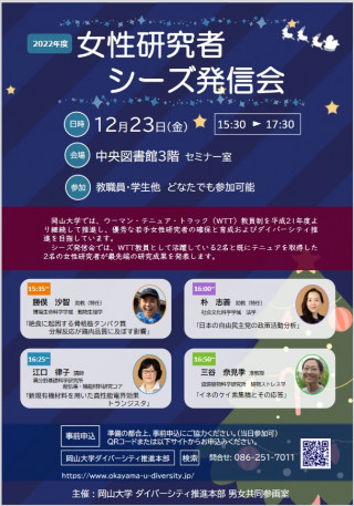 今回のシーズ発信会では、WTT教員として活躍している2人と既にテニュアを取得した2人の女性研究者が最先端の研究成果を、2022年12月23日(金) に岡山大学津島キャンパスの岡山大学附属中央図書館で開催します。