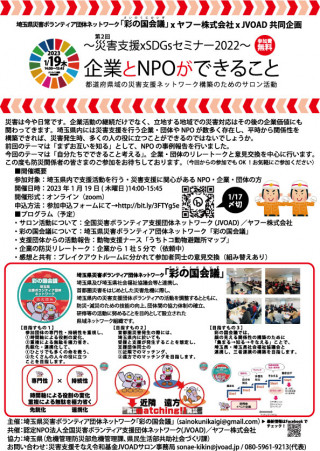 主催:埼玉県災害ボランティア団体ネットワーク「彩の国会議」 (sainokunikaigi(a)gmail.com)