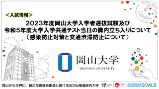 本学において実施する2023年度岡山大学入学者選抜試験及び令和5年度大学入学共通テストについて,本年度においては,新型コロナウイルスの状況を鑑み,受験者以外(高等学校教員,保護者,予備校講師等)の大学構内への立ち入りを全面禁止といたします(控室の使用も不可)ので,ご協力よろしくお願いいたします。