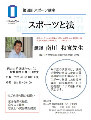 今回、第8回となるスポーツ講座「スポーツと法」を2023年1月18日(水) に岡山大学津島キャンパス(岡山市北区)にて開催します。