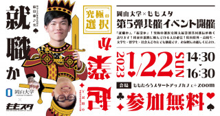 国立大学法人岡山大学(本部:岡山市北区津島中、学長:槇野博史)の岡山大学起業部では、おかやま・スタートアップ支援拠点運営委員会ともに、2023年1月22日(日) に【岡山大学起業部×ももスタ共催イベント第5弾】岡大起業部共同部長に聞く「就職か、起業か」をJR岡山駅前のももたろう・スタートアップカフェ(岡山市北区)とオンライン(zoom)のハイブリッドで開催します。