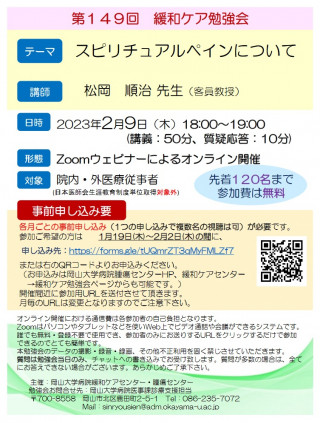 第149回緩和ケア勉強会を2023年2月9日(木) 18:00~19:00に「スピリチュアルペインについて」と題して、オンラインで開催します。
