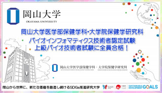 国立大学法人岡山大学(本部:岡山市北区、学長:槇野博史)の医学部保健学科・大学院保健学研究科では、2022年度の「バイオインフォマティクス技術者認定試験」を大学院生4名、教員1名が受験しました。さらに2022年度の「上級バイオ技術者認定試験」に大学院生2名、学部学生(検査技術科学専攻3年)3名が受験しました。それぞれの受験において、全員が合格しました。