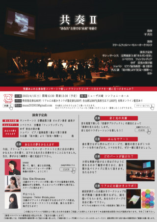 2020年2月 、コロナ禍直前に開催された「共奏」の初回では、来場者のみなさんとともにクラシックコンサートの新たなカタチを一つ、創ることができました。そこでは想像以上の反響・好評をいただき、どうやら新しい試みは多くの方に楽しんでいただけたようでした。また演奏者側もいつものクラシックコンサートとは違う楽しさを感じていて、その後も、多くの方に楽しんでいただけるような次の試みをぜひやってみたいとメンバーそれぞれに想いを温めてきました。ようやくウィズコロナの演奏のあり方が定着してきたところで、さらに新たな企画を携えて、「共奏Ⅱ」をお届けします!