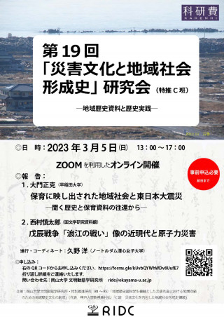 国立大学法人岡山大学(本部:岡山市北区、学長:槇野博史)文明動態学研究所(RIDC)では、第19回「災害文化と地域社会形成史」研究会-地域歴史資料と歴史実践-を、2023年3月5日(日) 13:00~17:00にオンラインで開催します。