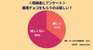 20~60代の男性200人に「結婚しているのにチョコをもらうのは嬉しいか」を聞いてみたところ、「嬉しい」と回答した人は35%、「嬉しくない」と回答した人は65%という結果になりました。