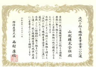 山越株式会社が優れた技術力による付加価値創出の分野で、2023年1月31日 に経済産業省「次代を担う繊維産業企業100選」に選定されました。