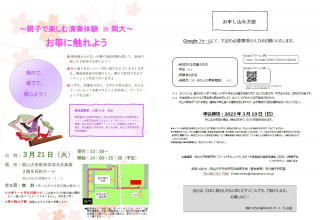 国立大学法人岡山大学(本部:岡山市北区、学長:槇野博史)の教育学部・大学院教育学研究科ですは、2023年3月21日 (火・祝日)に、箏曲演奏家の山路みほ先生をお迎えし、親子のためのお箏のワークショップ「〜親子で楽しむ演奏体験 in 岡大〜 お箏に触れよう」を本学津島キャンパスの岡⼭⼤学教育学部北⾳楽棟で開催します。