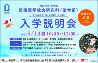 国立大学法人岡山大学(本部:岡山市北区、学長:槇野博史)の大学院医歯薬学総合研究科(薬学系)は、今後大学院への進学を目指す学内外の学生に医歯薬学総合研究科(薬学系)の教育、研究プログラムを広く周知することを目的として、2023年5月14日 に入学説明会を開催します。希望があれば薬学系教員との個別相談も実施します。