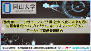 国立大学法人岡山大学(本部:岡山市北区、学長:那須保友)では、2023年2月24日 に開催した「教育学×データサイエンスで人間・社会・文化の未来を拓く 先駆者養成クロスプログラム」キックオフシンポジウムの様子を収録したアーカイブ動画を2023年4月 末まで配信します。